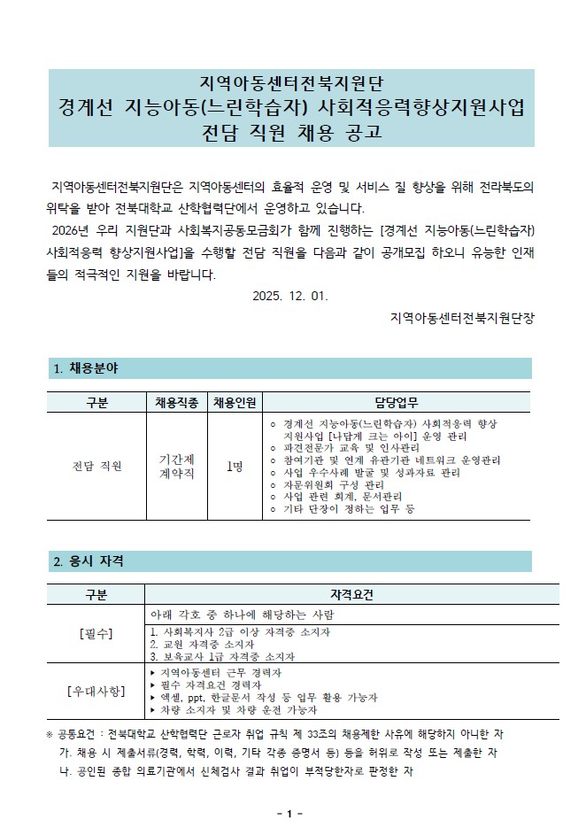 2026년 경계선지능아동(느린학습자) 사회적응력 향상 지원사업 전담직원 채용 공고