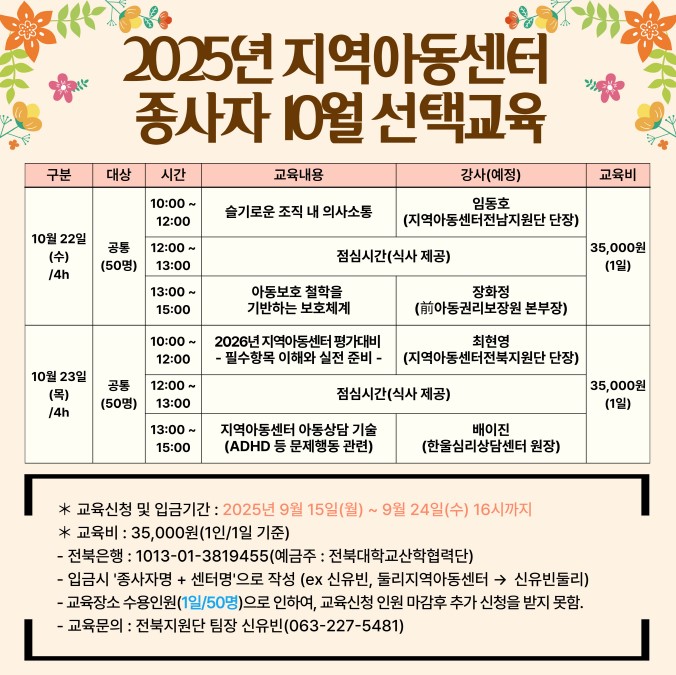 <2025년 전북특별치도 지역아동센터 종사자 10월 선택교육)>에 대하여 안내 드립니다.